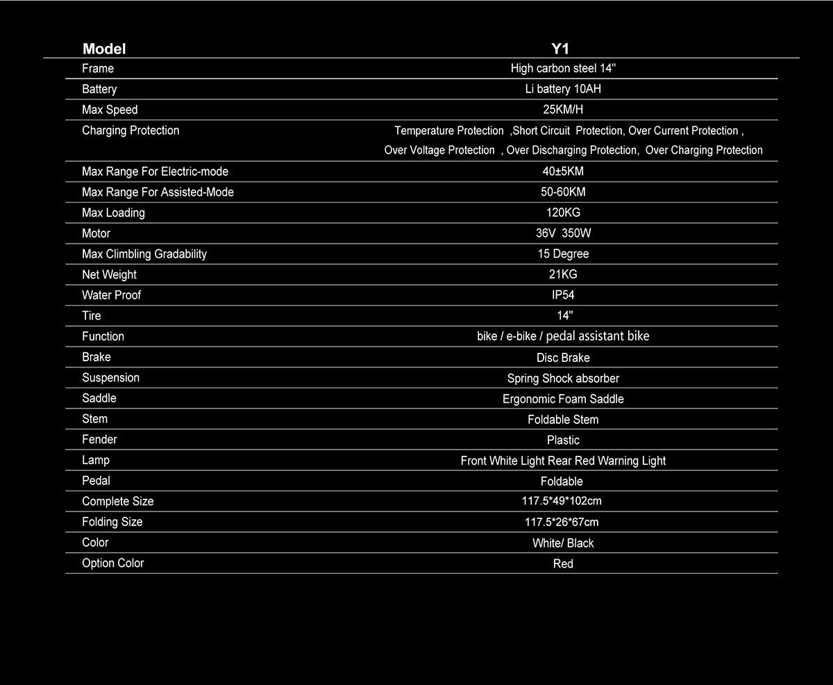 Chirrey Y1-14 (14" 36V 10Ah, 40km/60km, 25KM/H, 350W)