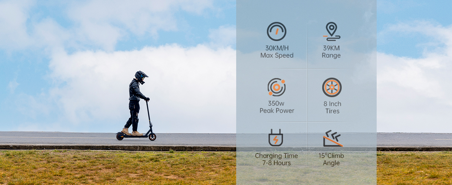 The 350W motor provides strong acceleration and enough power for a smooth ride on various terrains, including moderate inclines.